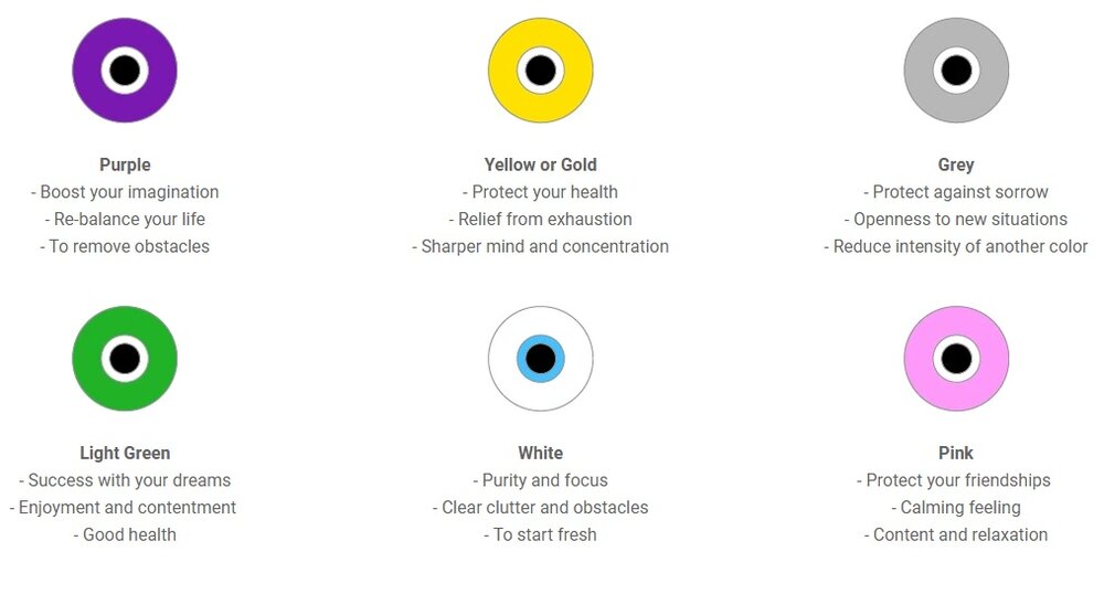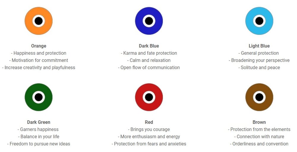 Den mest traditionelle farve på amuletten er det mørkeblå glas med en lidt lysere blå iris, men der findes faktisk mange forskellige farver, som beskytter og styrker forskellige ting.