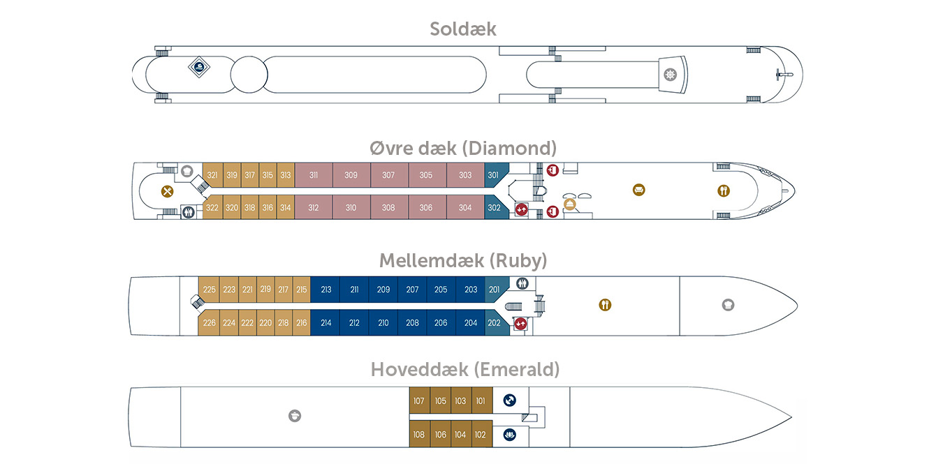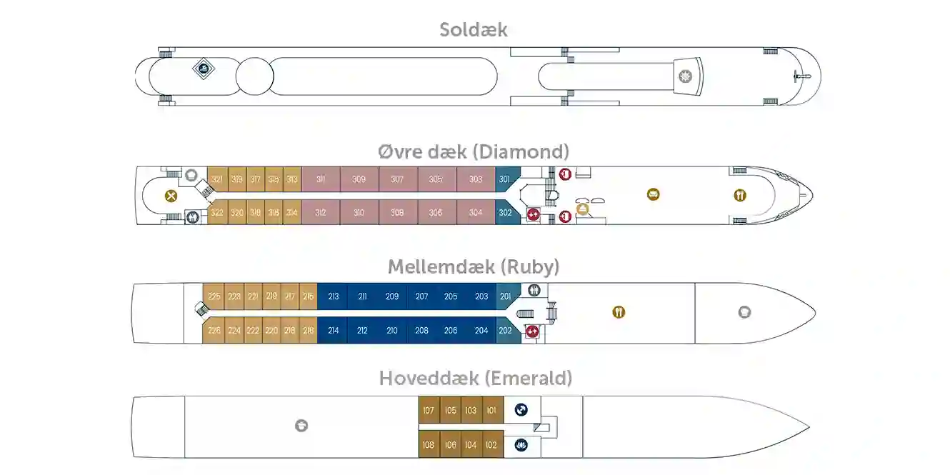 Et særligt højdepunkt ombord er de tre førsteklasses restauranter – herunder MOMENTS, som byder på gourmetoplevelser på stjerneniveau. I panoramaloungens bar kan man nyde udsøgte drikke og gastronomiske fristelser i afslappede omgivelser.