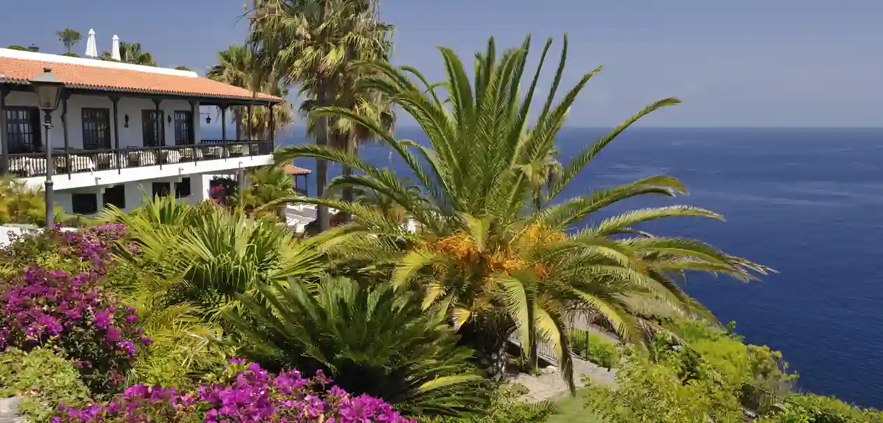 Dette FANTASTISKE højtliggende hotel ligger direkte på kanten til Atlanterhavet på øen La Gomera. Hotellet er omgivet af en 70.000 m2 stor tropisk have med masser af farverige eksotiske blomster. At bo på dette enestående hotel er en oplevelse udover det sædvanlige, og det er let at forstå, at tidligere forbundskansler Angela Merkel har været her flere gange, og at det hurtigt blev hendes yndlingshotel. I disse eventyrlige rammer er det skønt at slappe af - og nyde livet på bedste vis. I det fjerne ses Tenerife og vulkanen Teide.