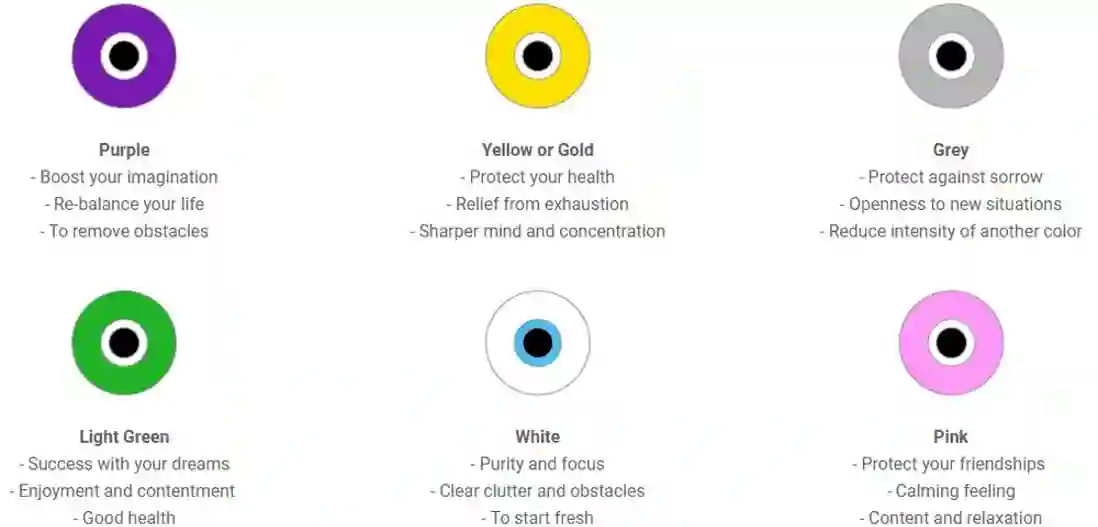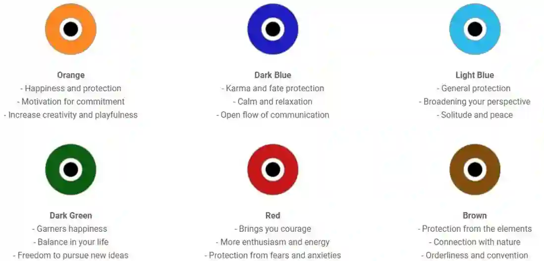 Den mest traditionelle farve på amuletten er det mørkeblå glas med en lidt lysere blå iris, men der findes faktisk mange forskellige farver, som beskytter og styrker forskellige ting.