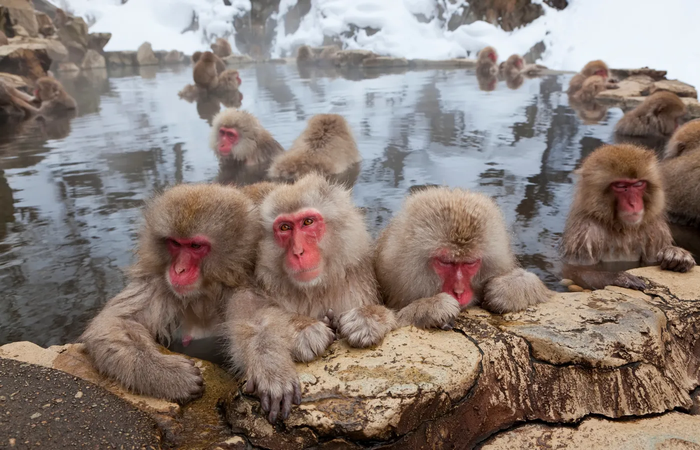 Her er ingen bure - sneaberne bevæger sig frit i det dampende landskab og tager lange, afslappede dyp i onsen – de traditionelle varme kilder, som japanerne selv sværger til. Det er et særsyn at iagttage aberne sidde i det varme vand, fuldstændig afslappede – som var de gæster i en luksusspa. Ofte med sne i pelsen og ro i blikket sidder de skulder ved skulder og nyder varmen. Aberne lader sig ikke forstyrre af nysgerrige besøgende. Alle har respekt for dyrenes frihed og færdes stille i området for ikke at ødelægge stemningen.