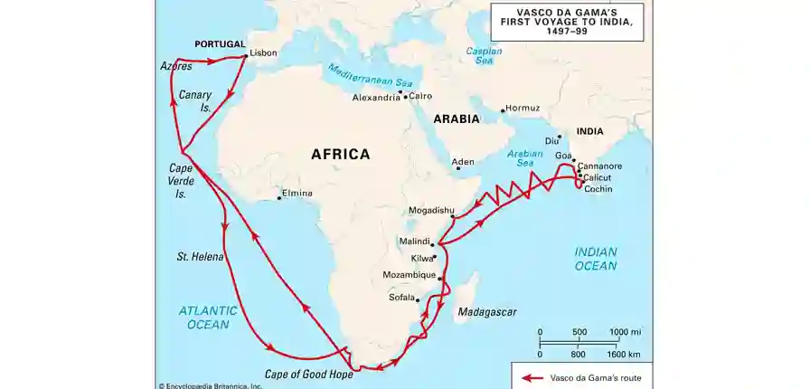 Inden afrejse bad Vasco en bøn i en kirke i Lissabons forstad Belém (navnet betyder Betlehem). Heldigvis skulle hans storebror Paulo også med, han var kaptajn på rejsen til Indien. Da de nåede Indien året efter var besætningen overbeviste om, at de havde fundet en kirke, men det var et hinduistisk tempel med en gudestatue med 4 arme! De kom i karambolage med lokalbefolkningen, da de ville fortælle dem, at deres Gud var bedre - og de fik hurtigt problemer med araberne, som hidtil havde haft monopol på Indienshandlen.