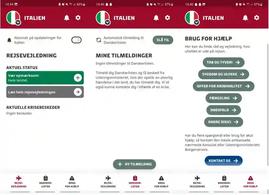 - I appen kan du tilmelde dig Danskerlisten for det land, du rejser til eller opholder dig i. Så kan du modtage beskeder fra Udenrigsministeriet via notifikationer i appen, SMS og e-mail, hvis der opstår en alvorlig hændelse i landet. UM vil også kunne kontakte dig direkte i tilfælde af en krise. Du kan tilmelde dig Danskerlisten, både når du rejser i Europa og længere væk. Du kan også tilmelde dig, hvis du bor fast i udlandet. Tilmelding til Danskerlisten er frivilligt.