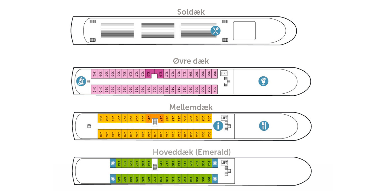 Reception, elevator (fra hoveddæk til øverste dæk – men ikke til soldækket) Spa-område, lille butik samt fitnessrum. På soldækket er der solstole og rygeområde.