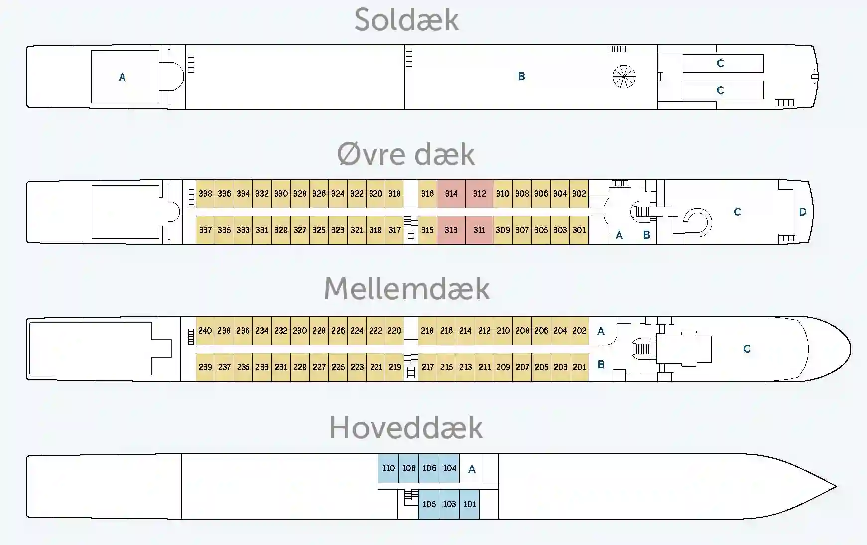 De 4 dæk er optimalt udnyttet til elegante og komfortable fællesområder og velindrettede kahytter. Skibet er 135 m. lang og 11,45 m. bred og har 85 kahytter heraf 4 suiter. Modsat mange andre skibe, så er alle kahytter på både mellemdæk og øvre dæk udstyret med fransk altan.